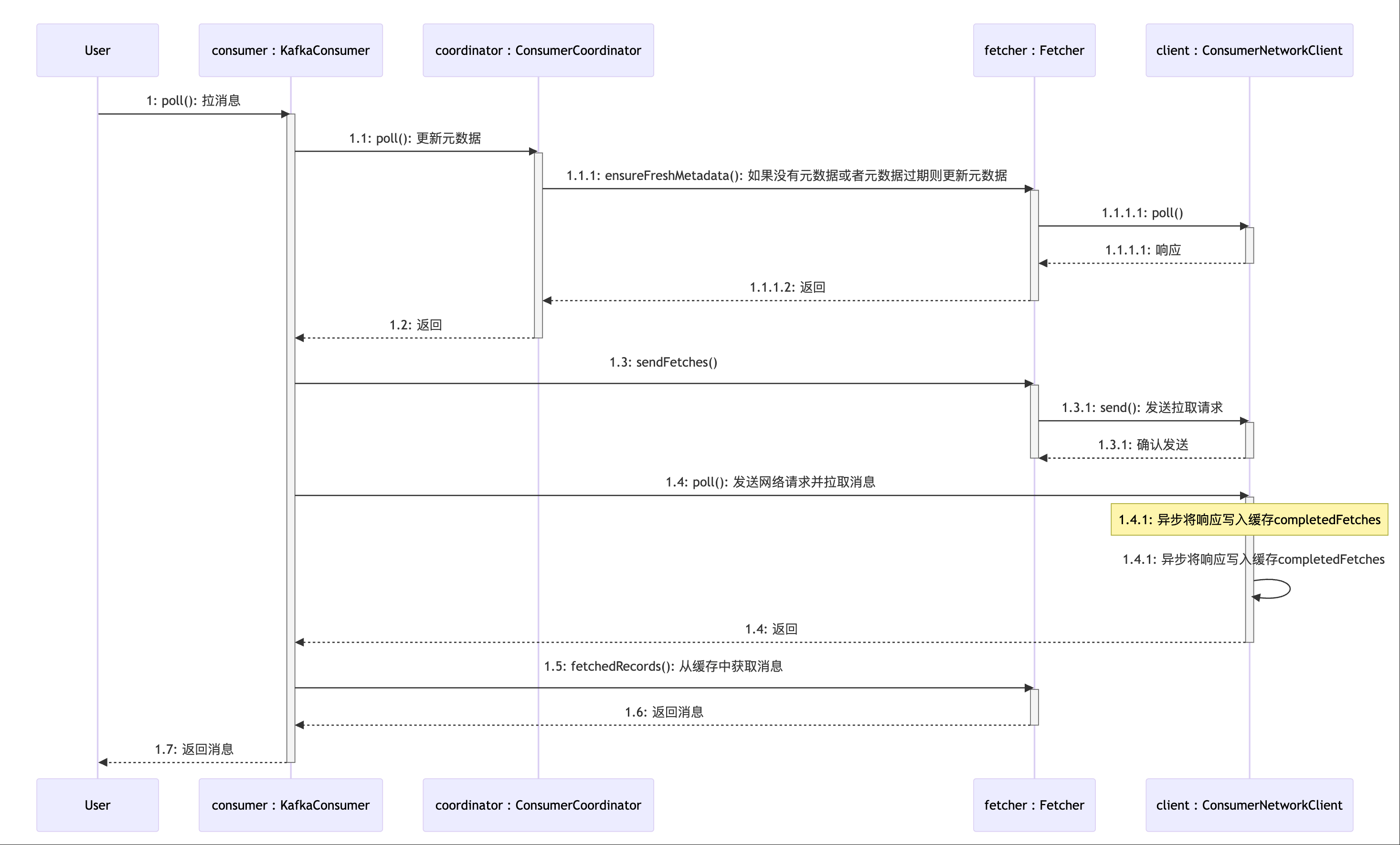 * 这是消费者拉取数据的核心内部方法。它负责与 Kafka Broker 通信以获取消息。