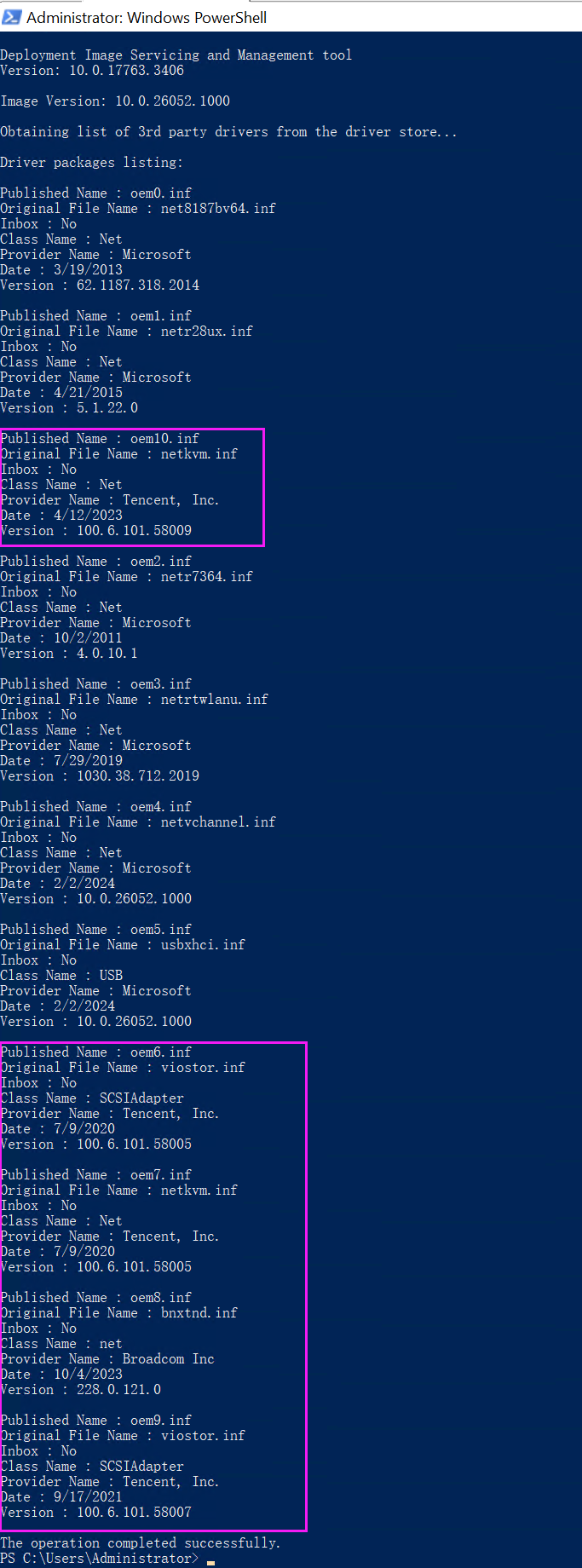 (如下图我集成了58005虚拟化硬盘和网卡驱动,有这2个对普通cvm就够用了,此外我还集成了58007虚拟化硬盘驱动、58009虚拟化网卡驱动,还集成了裸金属机器的博通网卡驱动bnxtnd.inf,仅为示例)