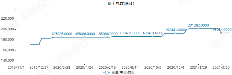 截止2021年3月26日,家居(中信)板块沪深成分股个数为38,在近几年中保持平稳趋势。企业总市值在近几年逐年上升,截止2021年4月15日,企业总市值为3797.8933亿元,企业员工总数达193084人。