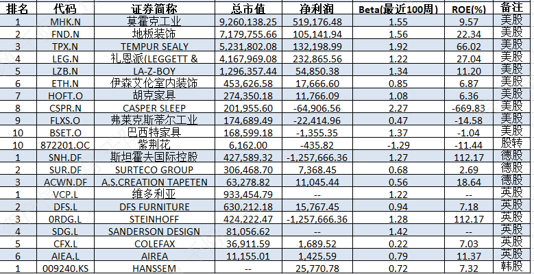 全球非中国主要企业有地板装饰[FND.N]、TEMPUR SEALY INTERNATIONAL[TPX.N]、礼恩派(LEGGETT & PLATT)[LEG.N]、LA-Z-BOY[LZB.N]、伊森艾伦室内装饰[ETH.N]、胡克家具[HOFT.O]、CASPER SLEEP[CSPR.N]、弗莱克斯蒂尔工业[FLXS.O]、巴西特家具[BSET.O]、紫荆花[872201.OC]、斯坦霍夫国际控股[SNH.DF]、SURTECO GROUP[SUR.DF]、A.S.CREATION TAPETEN[ACWN.DF]、维多利亚[VCP.L]、DFS FURNITURE[DFS.L]、STEINHOFF INTERNATIONAL[0RDG.L]、SANDERSON DESIGN[SDG.L]、COLEFAX[CFX.L]等。