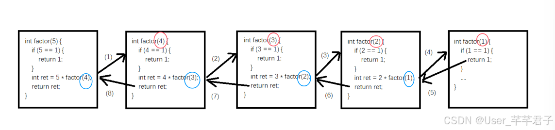 计算5的阶乘,fac(5) 会调用发出fac(4) , fac(4) 又会调用fac(3) ,以此类推…直到fac(1)。然后从fac(1) 开始返回结果,逐步计算出fac(5)的值,这个过程在Java虚拟机的