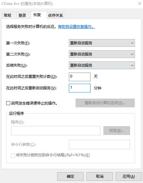 第一次失败、第二次失败以及后续失败的相应操作,将其设置为重新启动服务。并且可以在这里设置重置失败计数以及重启服务的时间。如下图所示: