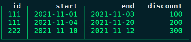 insert into rate values (111, '2021-11-01', '2021-11-03', 100),(111, '2021-11-04', '2021-11-20', 200),(222, '2021-11-10', '2021-11-12',300);