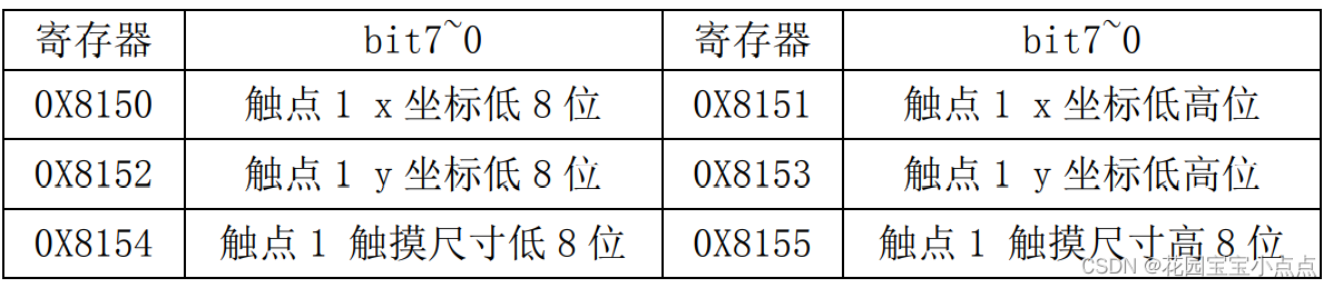 我们一般只用到触点的 x,y 坐标,所以只需要读取 0X8150~0X8153 的数据,组合即可得到触点坐标。其他 4 组分别是:0X8158、0X8160、0X8168 和 0X8170 等开头的 16 个寄存器组成,分别针对触点 2~4 的坐标。同样 GT9147 也支持寄存器地址自增,我们只需要发送寄存器组的首地址,然后连续读取即可,GT9147 会自动地址自增,从而提高读取速度。