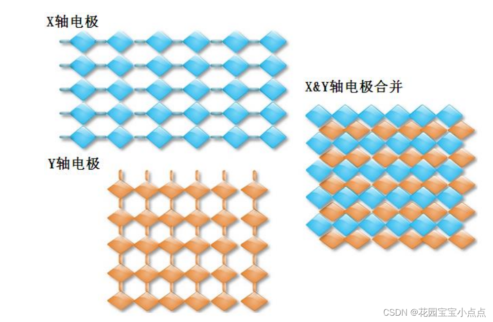 投射电容式触摸屏是传感器利用触摸屏电极发射出静电场线。一般用于投射电容传感技术的电容类型有两种:自我电容和交互电容。 自我电容又称绝对电容,是最广为采用的一种方法,自我电容通常是指扫描电极与地构成的电容。在玻璃表面有用 ITO 制成的横向与纵向的扫描电极,这些电极和地之间就构成一个电容的两极。当用手或触摸笔触摸的时候就会并联一个电容到电路中去,从而使在该条扫描线上的总体的电容量有所改变。在扫描的时候,控制 IC 依次扫描纵向和横向电极,并根据扫描前后的电容变化来确定触摸点坐标位置。笔记本电脑触摸输入板就是采用的这种方式,笔记本电脑的输入板采用 X*Y 的传感电极阵列形成一个传感格子,当手指靠近触摸输入板时,在手指和传感电极之间产生一个小量电荷。采用特定的运算法则处理来自行、列传感器的信号来确定手指的位置。 交互电容又叫做跨越电容,它是在玻璃表面的横向和纵向的 ITO 电极的交叉处形成电容。 交互电容的扫描方式就是扫描每个交叉处的电容变化,来判定触摸点的位置。当触摸的时候就会影响到相邻电极的耦合,从而改变交叉处的电容量,交互电容的扫面方法可以侦测到每个交叉点的电容值和触摸后电容变化,因而它需要的扫描时间与自我电容的扫描方式相比要长一些, 需要扫描检测 X*Y 根电极。目前智能手机/平板电脑等的触摸屏,都是采用交互电容技术。