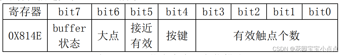这里,我们仅关心最高位和最低 4 位,最高位用于表示 buffer 状态,如果有数据(坐标/ 按键),buffer 就会是 1,最低 4 位用于表示有效触点的个数,范围是:0~5,0,表示没有触摸, 5 表示有 5 点触摸。这和前面 OTT2001A 的表示方法稍微有点区别,OTT2001A 是每个位表示 一个触点,这里是有多少有效触点值就是多少。最后,该寄存器在每次读取后,如果 bit7 有效, 则必须写 0,清除这个位,否则不会输出下一次数据!