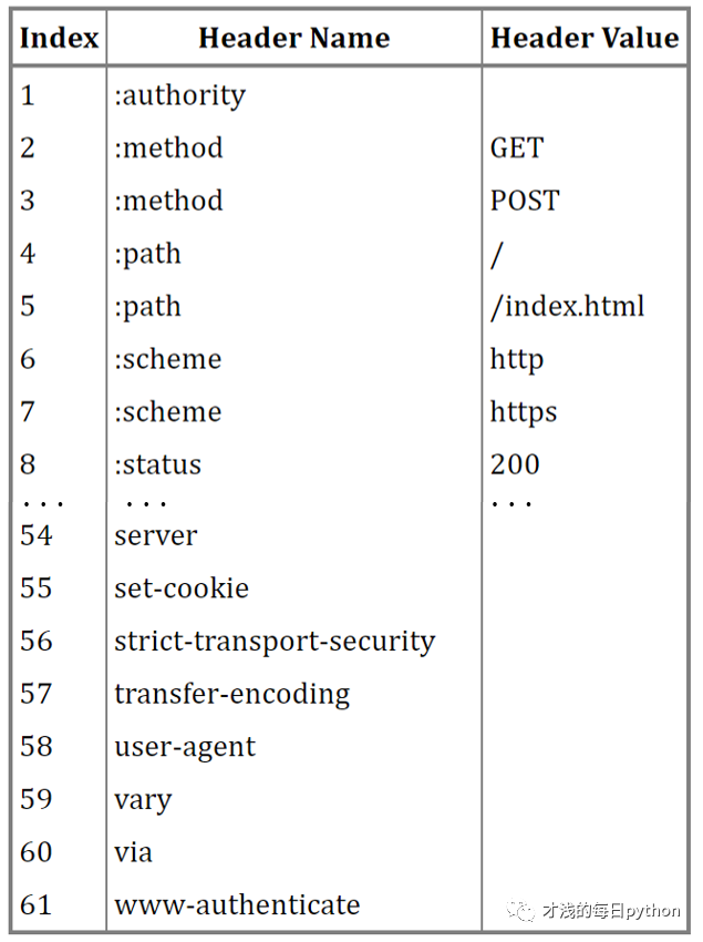 首先基于二进制编码,不需要加入空格、冒号、\r\n作为分隔符,用表示长度的1个字节即可。HTTP/2用静态表描述Host头部,将高频头分别对应一个数字写死到HTTP/2框架代码中。这里用到了一个信息论的概念“高频出现的信息用较短编码表示后可压缩体积”。