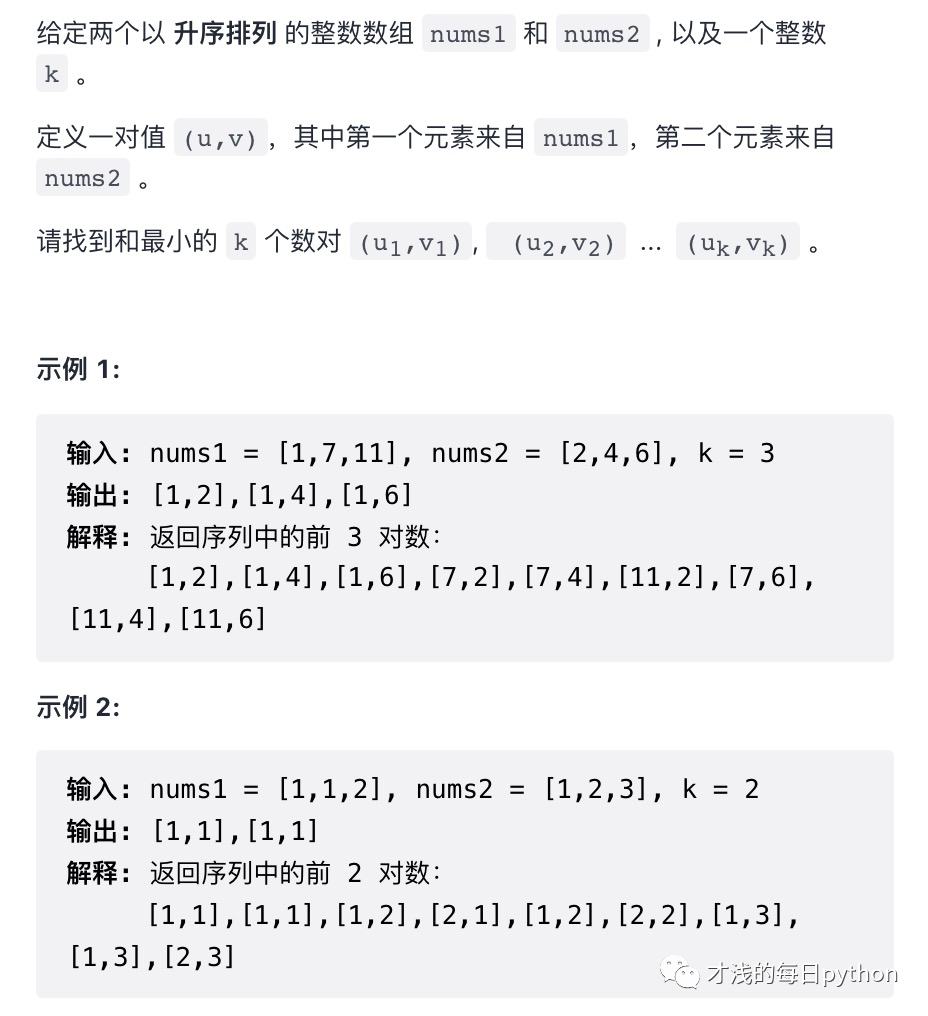 既然是每次去拿到最小值,我们可以使用小根堆来做,在python中使用heapq默认是小根堆。那么第一个入堆并从堆中弹出的答案是nums1[0]+nums2[0],再让nums1[0]+nums2[1]入堆,弹出第二个答案,以此类推;然后考虑取k对数字怎么实现,我们可以直接动态生成k个,那么循环条件应为当堆不为空且len(pairs)<7时动态入堆和出堆(pairs是存放最终答案的列表)。