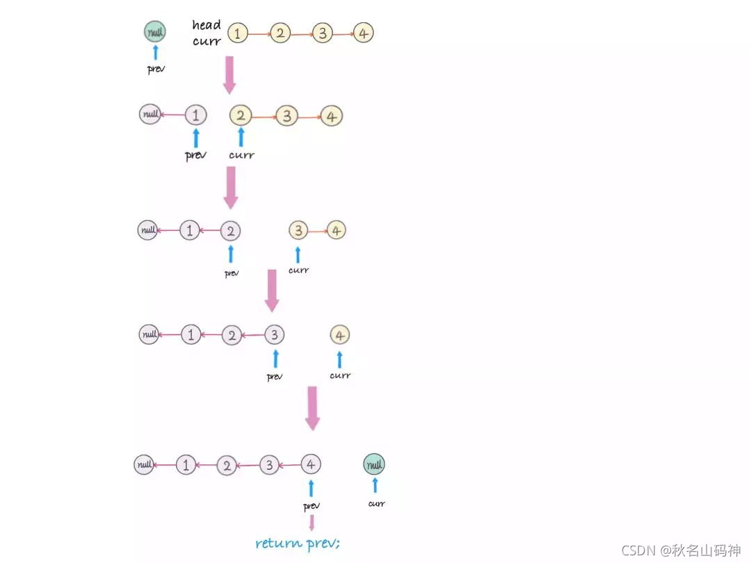 可以看到我在实现从大到小时,使用了俩个方法,我们为什么不直接反转呢?原因还是从效率上考虑的,首先我们要明白反转的本质是: 初始化一个为 null 的 previous node(prev),然后遍历链表的同时,当前 node (curr)的下一个(next)指向前一个 node(prev), 在改变当前 node 的指向之前,用一个临时变量记录当前 node 的下一个 node. 即