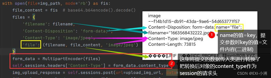 response = sessions.post(url=upload_img_url, data=form_data)注释:需要注意上传文件接口的参数,name的值,filename,Content-Type,格式: file={ ‘name的值’: (“filename”, “文件对象”, ‘内容类型’), … }