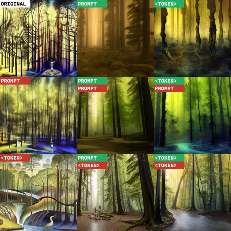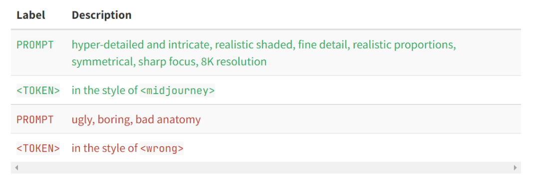 例如,Stable Diffusion 2.0 的一项测试输入可能是「cyberpunk forest by Salvador Dali, in the style of <midjourney>」以及一个negative prompt「in the style of <wrong>」分别对应绿色 “TOKEN” prompt 标签和红色“TOKEN” 标签。
