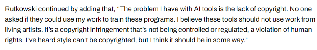 Greg Rutkowski说,“我在AI工具上遇到的问题是缺乏版权。没有人问他们是否可以用我的工作来训练这些程序。我认为这些工具不应该使用在世艺术家的作品。这是一种不受控制或监管的版权侵犯,是对人权的侵犯。我听说风格是不能有版权的,但我认为在某种程度上应该有。”