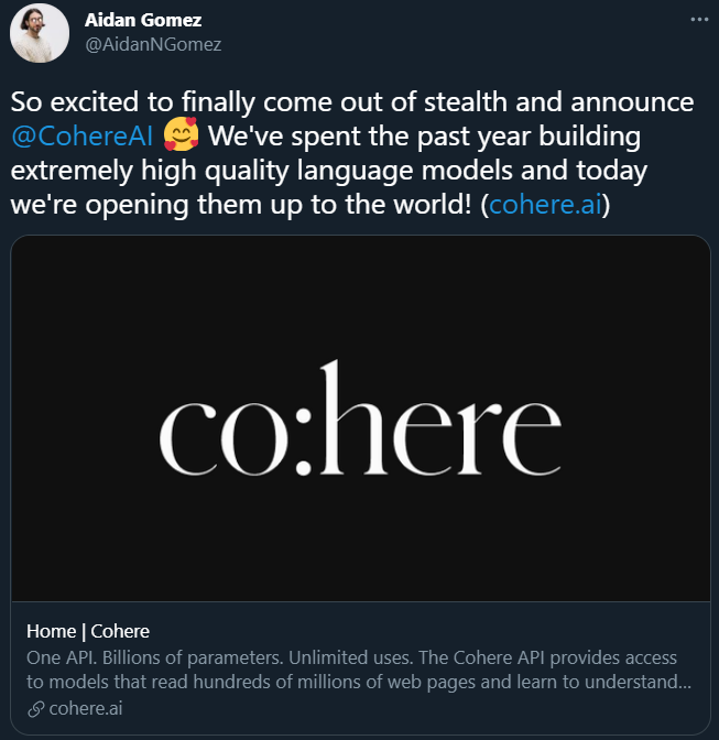 2021 年 5 月,Aidan Gomez 正式向外界介绍了这家公司,并宣布他们将基于自己训练的大型 NLP 模型为外界提供 API 服务。
