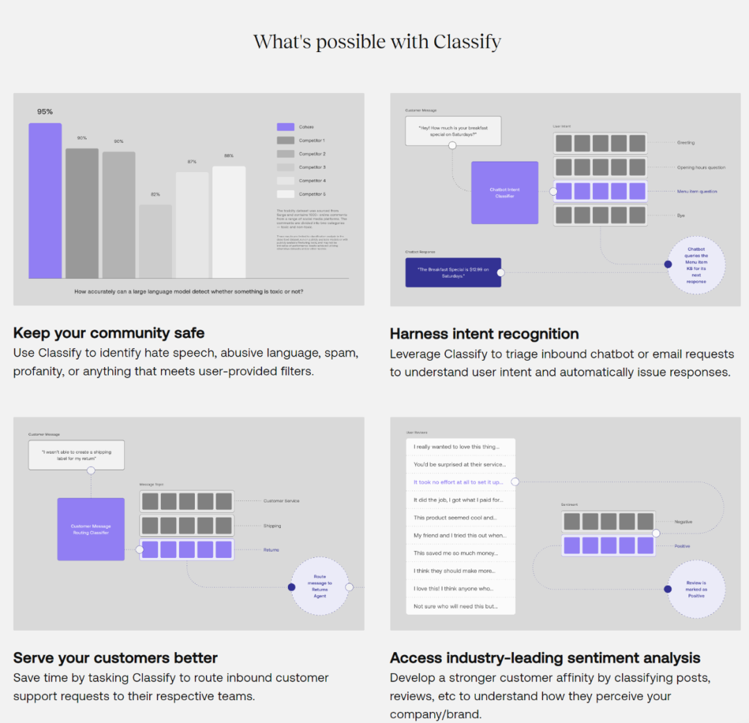 Classify 是一款内容理解软件,它使用顶尖的自然语言处理大模型来分析文本并将其归类,可以帮助网站识别有害言论、了解用户意图、区分正面 / 负面评价等。Cohere 表示,他们已经做出了一个可以在不同的库中使用的 API。