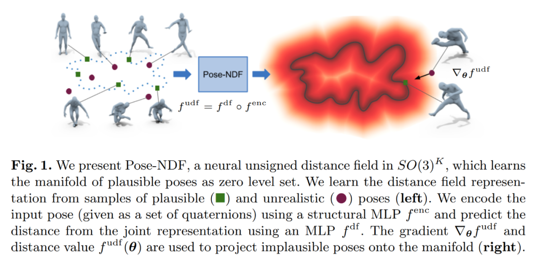 Pose-NDF 学习一系列各种可能的姿态作为神经隐式函数的零水平集(zero level set),将 3D 建模隐式曲面的思想扩展到高维域 SO(3)^K,其中人体姿态由单个数据点定义,由 K 个四元数表示。由此得到的高维隐函数可以对输入姿态进行微分,因此可以通过在 3 维超球体集合上使用梯度下降将任意姿态投射到流形(manifold)上。