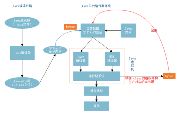 最后,把验证过后的字节码发送到“Java 解释器”和“及时编译器”交给“Java 运行系统”运行。