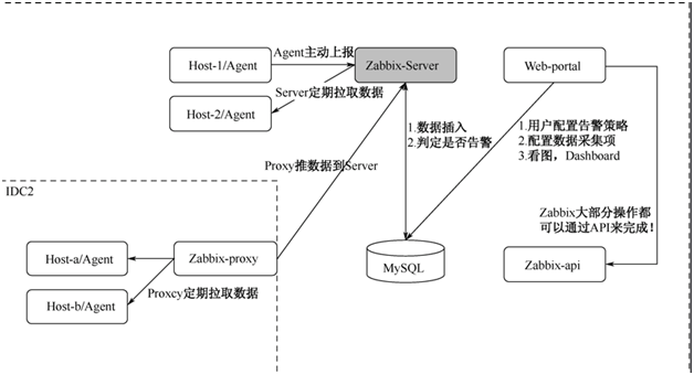 以 Server 拉取数据为例,用户在 Web-portal 中,设置需要监控的机器,配置监控项,告警策略。Zabbix-Server 会根据策略主动获取 Agent 的数据,然后存储到 MySQL 中。