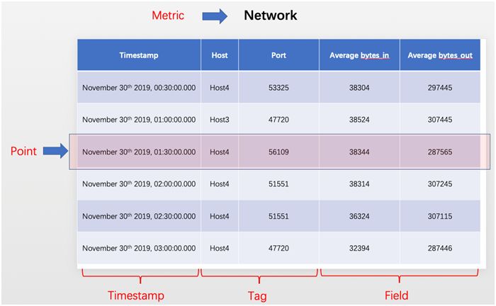 由于 IT 基础设施,运维监控和互联网监控的特性,这种方式被广泛应用。一般对时序数据进行建模分为三个部分,分别是:主体,时间点和测量值。