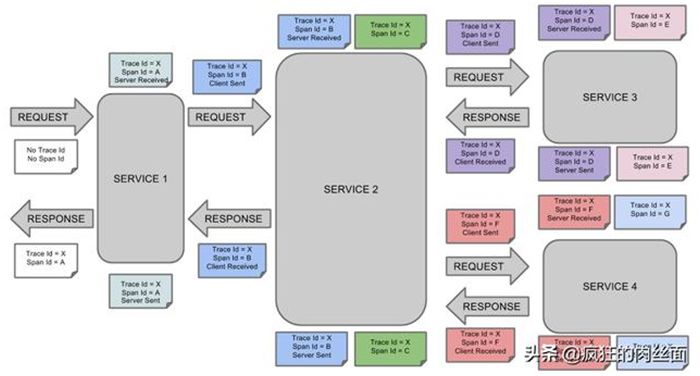 每次发起请求或者接受请求的状态分别记录成 Server Received,Client Sent,Server Sent,Client Received 四种状态来完成这个服务调用链路的跟踪的。
