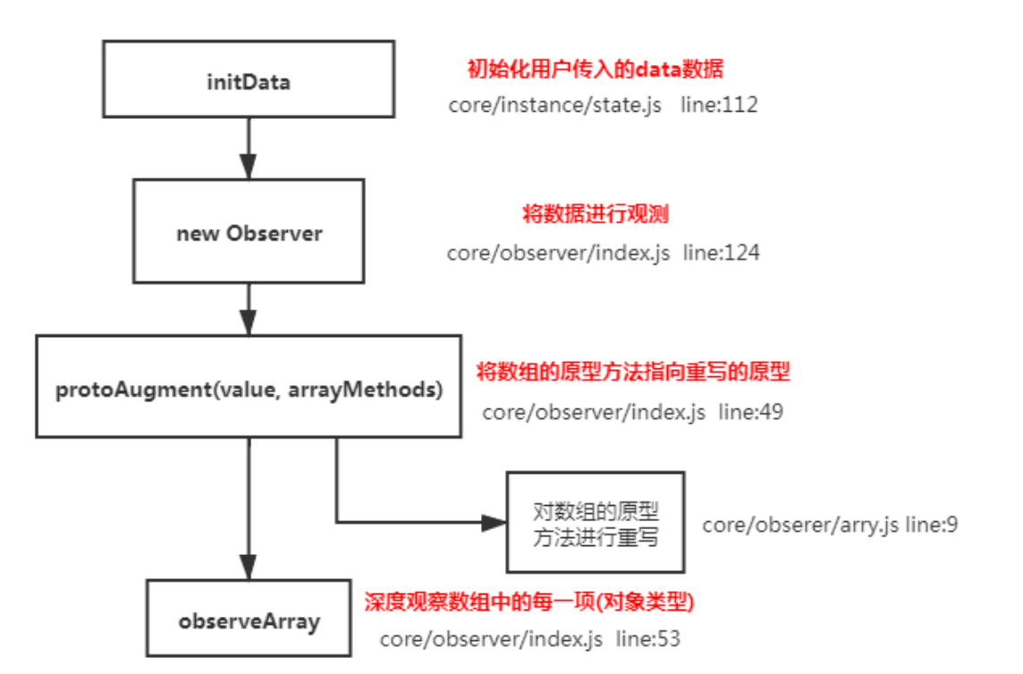 Vue将data中的数组,进行了原型链重写。指向了自己定义的数组原型方法,这样当调用数组api时,可以通知依赖更新,如果数组中包含着引用类型。会对数组中的引用类型再次进行监控。