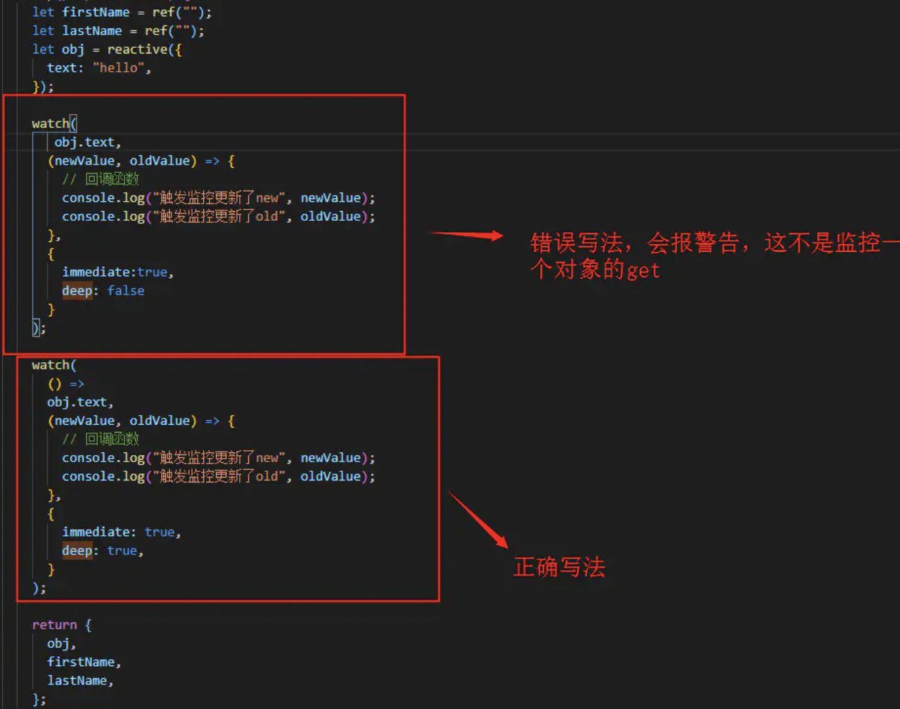 reactive的数据,想去使用watch监听数据改变,则无法正确获取旧值,并且deep属性配置无效,自动强制开启了深层次监听。ref 初始化一个对象或者数组类型的数据,会被自动转成reactive的实现方式,生成proxy代理对象。也会变得无法正确取旧值。proxy代理对象,就都会导致watch这个对象时,watch回调里无法正确获取旧值。watch监听对象时,如果在不需要使用旧值的情况,可以正常监听对象没关系;但是如果当监听改变函数里面需要用到旧值时,只能监听 对象.xxx`属性 的方式才行watch和watchEffect异同总结