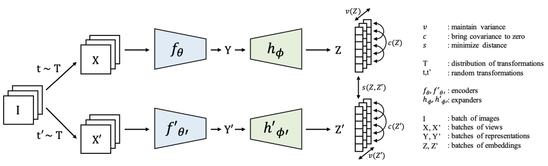 Facebook团队提出的VICREG是上述基于信息最大化表示学习方法的一个扩展,损失函数主要包括variance、invariance、covariance三个部分。模型的主体结构如下,仍然是一个孪生网络结构,输入一个样本的不同view互为正样本。