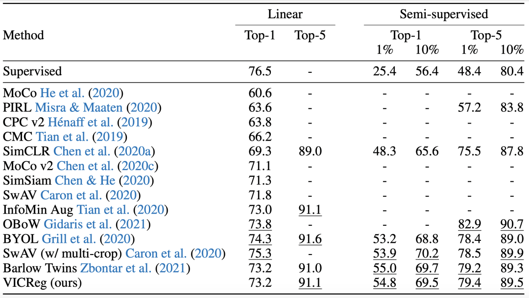 作者进行了一些实验验证VICREG表示学习方法的效果。在ImageNet数据集上,使用不同方法预训练的表示接一个线性层进行分类,或者基于预训练的表示使用部分数据进行finetune,对比图像分类效果,实验结果如下: