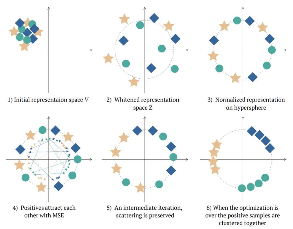 W-MSE的整体网络结构如上图,模型中输入一对互为正样本的样本对(例如一个图像的不同增强形式),使用共享参数Encoder分别编码后,增加一个whitening模块,对每个batch内的所有embedding进行白化,让embedding的各个维度变量线性无关,后面再接norm处理。下图形式化表明了W-MSE的用途,通过白化+norm让样本形成一个球形分布,正样本之间距离近,每个样本需要调整自己在圆周上的位置拉进正样本之间的距离,形成最终的簇。
