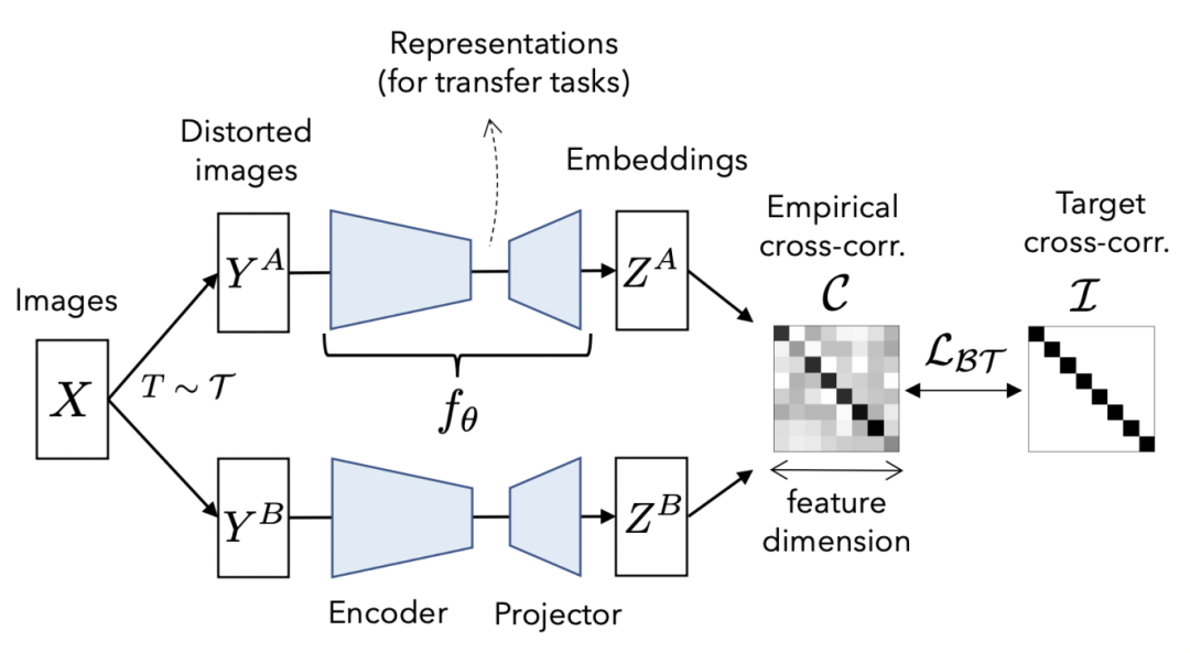 Barlow twins方法也是同样的思路,只是做法不同。在得到一对正样本的两个embedding后,计算两个向量各个变量之间的相关性矩阵,优化这个矩阵接近对角矩阵,以此实现embedding中各个变量之间线性无关。