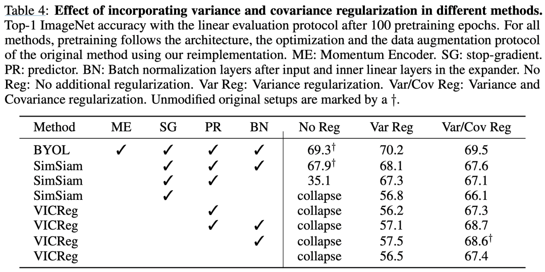 作者也对比了在不同方法上是否采用variance或covariance等loss的效果变化: