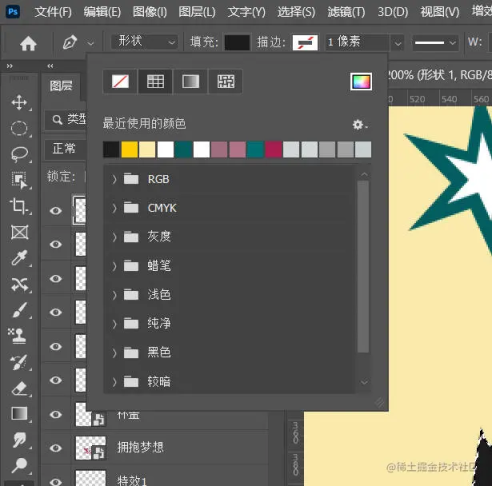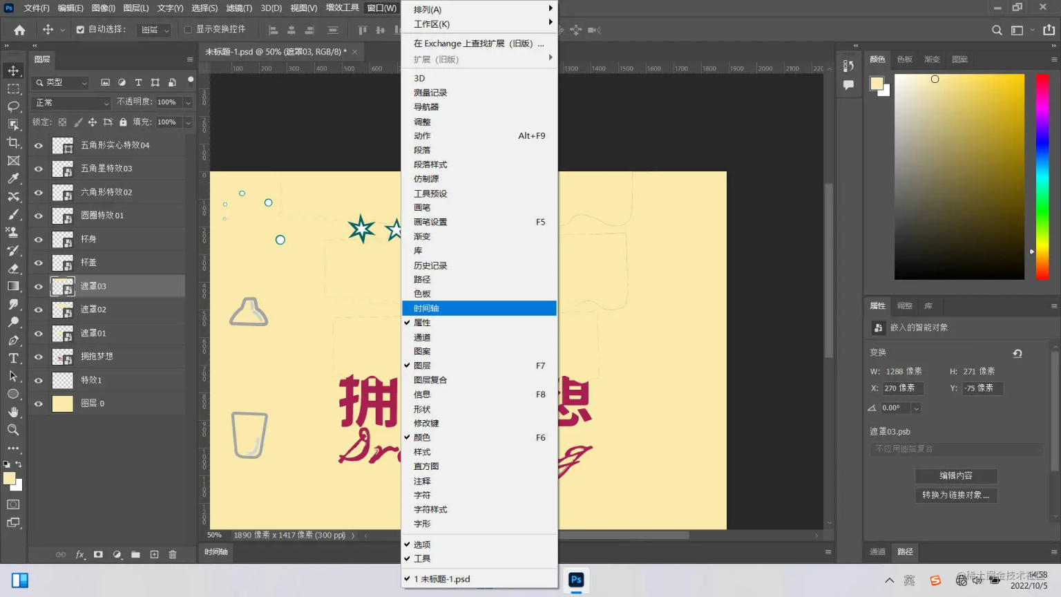 在杯子打开的时候,我们可以做一个特效,就是那种有东西冒出来的感觉,可以用空心圆空心几何型,做出来,当然你的这个,要么真的空心,要么和背景颜色一致,然后叫他们摆出一个造型,就可以转为智能对象了