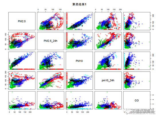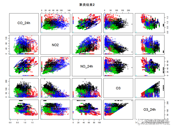 通过kmeans的可视化结果来看,kmeans方法比较好的将所有样本点区分开来,其中绿色的样本点各项指标值较低,红色样本点各项指标值较高,蓝色和黑色样本点主要在O3,NO2 等指标上有较明显的区别。为了具体比较每个类的指标,下面对每个类的数据特征进行描述。