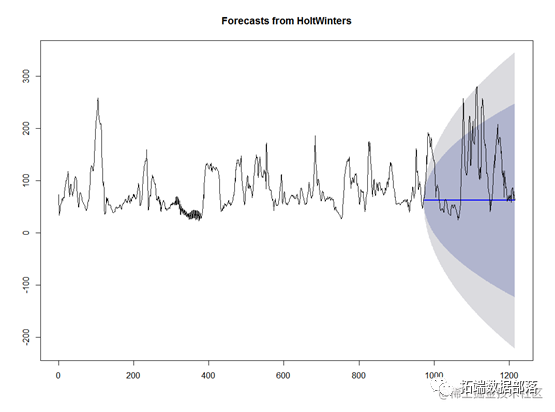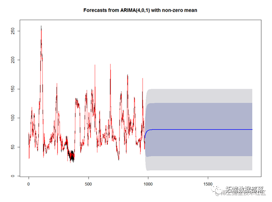 同样得到拟合和预测的值,红色代表拟合的样本点,黑色代表原始的样本点,后面的代表预测的数据和置信区间,可以看到样本拟合的状况较好,预测的区间比指数平滑法要精确。