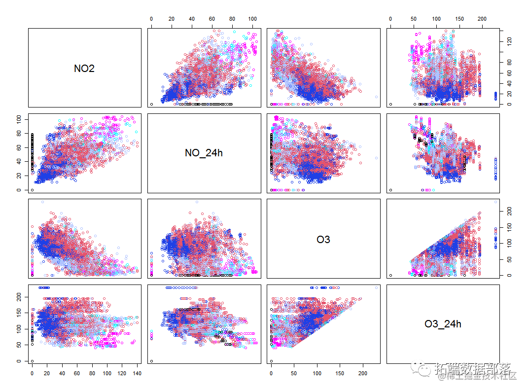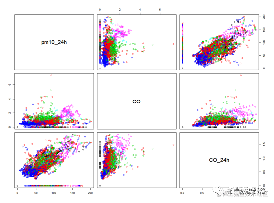上面的图中不同颜色代表不同的空气质量地区,从所有变量的两两关系散点图来看,可以看到pm2.5和pm10的关系图可以比较好的区分出不同空气质量的地区。并且他们之间存在正相关关系。