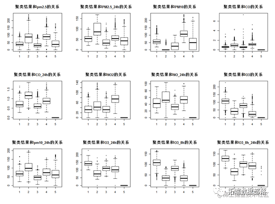 从上面的箱线图,可以看到每个类别的特征,第一类O3值较高,第二个类PM2.5的值较高,第三个类pm2.5,NO值较低,第4类O3水平较低,PM10值较高,第五类的各个指标值都相对较低。因此第5个类别空气质量比较好。其他各个类别的地区在不同指标上有不同特征。