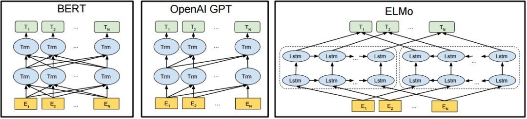 Transformer 在机器翻译任务上面证明了其超过 LSTM/GRU 的卓越表示能力。从 RNN 到 Transformer,模型的表示能力在不断的增强,语义表示模型的骨架也经历了这样的一个演变过程。如图2所示,该图为BERT、GPT 与 ELMo的结构示意图,可以看到 ELMo 使用的就是 LSTM 结构,接着 GPT 使用了 Transformer Decoder。进一步 BERT 采用了双向 Transformer Encoder,从理论上讲其相对于 Decoder 有着更强的语义表示能力,因为Encoder接受双向输入,可同时编码一个词的上下文信息。最后在NLP任务的实际应用中也证明了Encoder的有效性,因此ERNIE也采用了Transformer Encoder架构。