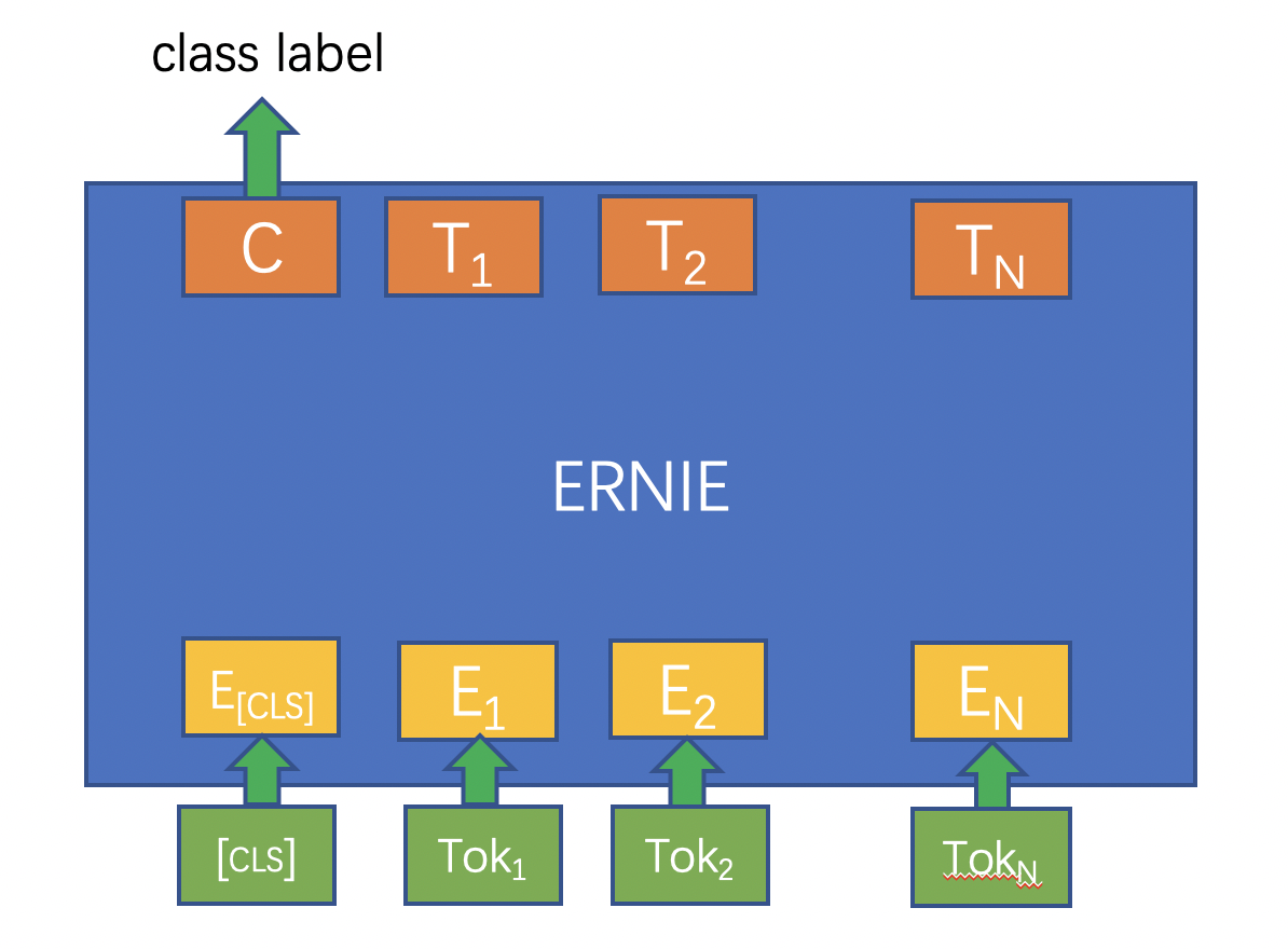 完成预训练后,如何用 ERNIE 来解决具体的 NLP 问题呢?下面以单句分类任务(如情感分析)为例,介绍下游 NLP 任务的解决过程: