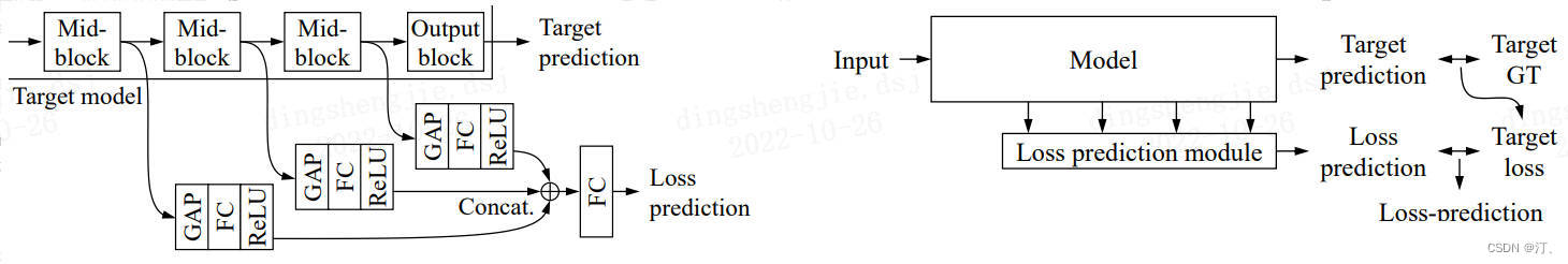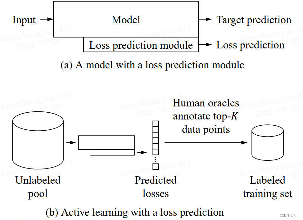 learning loss 2019 在任务模型上加一个小的附属子网络用来学习预测样本的损失值。训练任务模型的时候,也同时训练这个预测损失模块,之后就用这个模块来预测对哪个未标注样本的损失大,就选他。整个算法的流程图如下