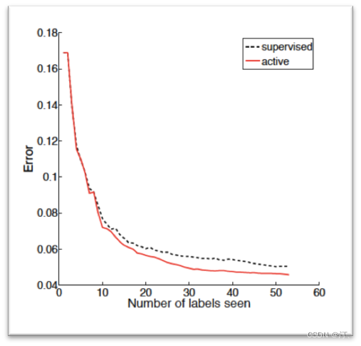 从上图也可以看出来,在相同数目的标注数据中,主动学习算法比监督学习算法的分类误差要低。这里注意横轴是标注数据的数目,对于主动学习而言,相同的标注数据下,主动学习的样本数>监督学习,这个对比主要是为了说明两者对于训练样本的使用效率不同:主动学习训练使用的样本都是经过算法筛选出来对于模型训练有帮助的数据,所以效率高。但是如果是相同样本的数量下去对比两者的误差,那肯定是监督学习占优,这是毋庸置疑的。