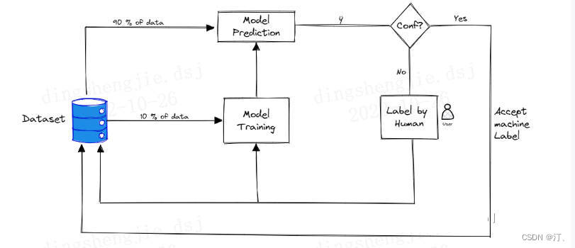 主动学习不是一次为所有的数据收集所有的标签,而是对模型理解最困难的数据进行优先级排序,并仅对那些数据要求标注标签。然后模型对少量已标记的数据进行训练,训练完成后再次要求对最不确定数据进行更多的标记。