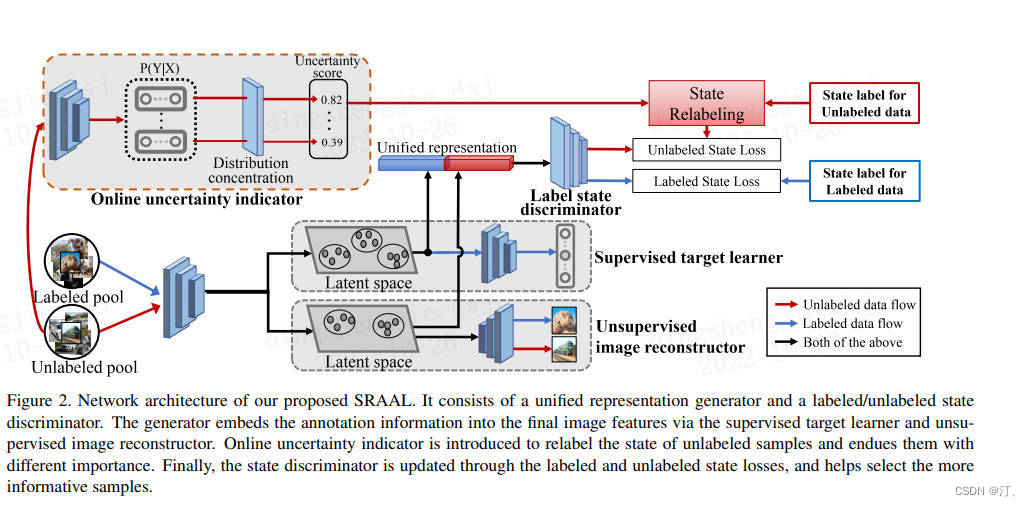 SRAAL(论文 https://openaccess.thecvf.com/content_CVPR_2020/html/Zhang_State-Relabeling_Adversarial_Active_Learning_CVPR_2020_paper.html)是VAAL的一个改进版。在VAAL中,判别器的训练的时候只有两种状态,标注/未标注。SRAAL的作者认为这样忽略了一些信息,有时候任务模型已经能很确信的对某个未标注样本做预测了,就应该降低选择这个样本的优先级。