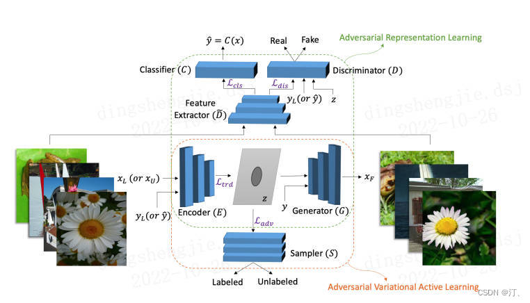而对于样本的选择,是通过一个对抗网络来实现的,该对抗网络被用来区分一个样本是已标注还是未标注。因此上文的VAE还有一个额外的任务,即他的编码要让判别器难以区分已经标注还是没有标注。
