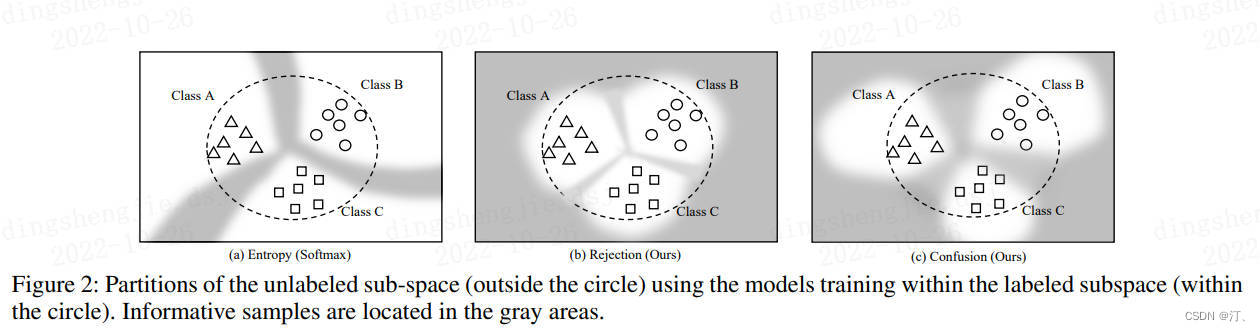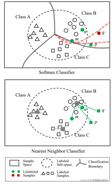 在主动学习中,初始阶段使用非常少的标注样本训练模型,意味着大量的未标注样本可能都是OOD样本,若模型过早的给这部分样本一个过度自信的预测概率,就可能使我们错失一些有价值的OOD样本。如图所示,初始训练阶段,模型缺乏虚线框以外的区域的训练数据,但softmax分类器仍然会对这些区域给出很自信的预测,导致选择新的待标注样本时,图中的q点会被忽略,而若q点正好不是class B,则会影响主动学习的性能。