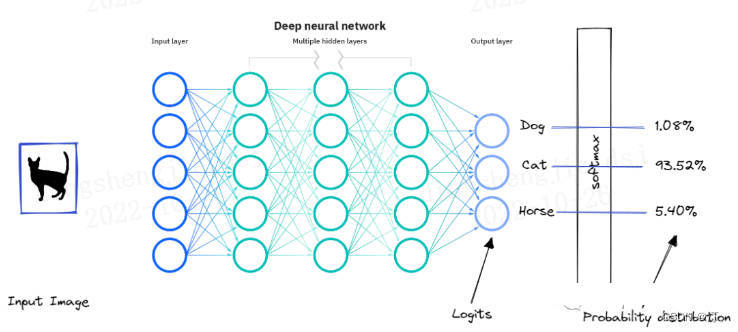 让我们以一个具体的例子,假设正在尝试建立一个多类分类,以区分3类猫,狗,马。该模型可能会给我们以下预测: