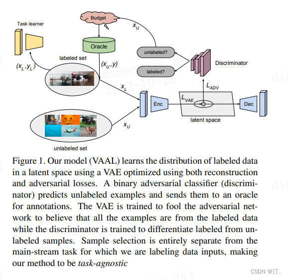 Variational Adversarial Active Learning(地址 2019年)描述了一种基于池的半监督主动学习算法,它以对抗的方式(关于对抗学习的详细介绍参见这里)隐式地学习了这种采样机制。与传统的主动学习算法不同,VAAL与任务无关,也就是说,它不依赖于试图获取标注数据的任务的性能。VAAL使用变分自编码器(VAE)和训练好的对抗网络来学习潜在空间,以区分未标注和标注的数据。