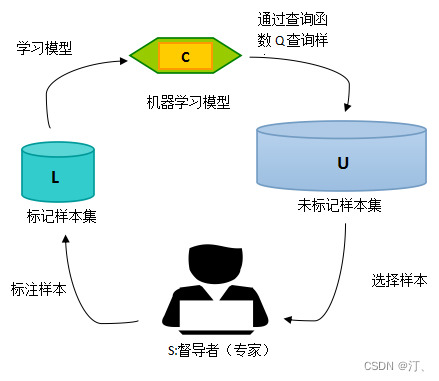 其中 C 为一组或者一个分类器,L是用于训练已标注的样本。Q 是查询函数,用于从未标注样本池U中查询信息量大的信息,S是督导者,可以为U中样本标注正确的标签。学习者通过少量初始标记样本L开始学习,通过一定的查询函数Q选择出一个或一批最有用的样本,并向督导者询问标签,然后利用获得的新知识来训练分类器和进行下一轮查询。主动学习是一个循环的过程,直至达到某一停止准则为止。 这个准则可以是迭代次数,也可以是准确率等指标达到设定值