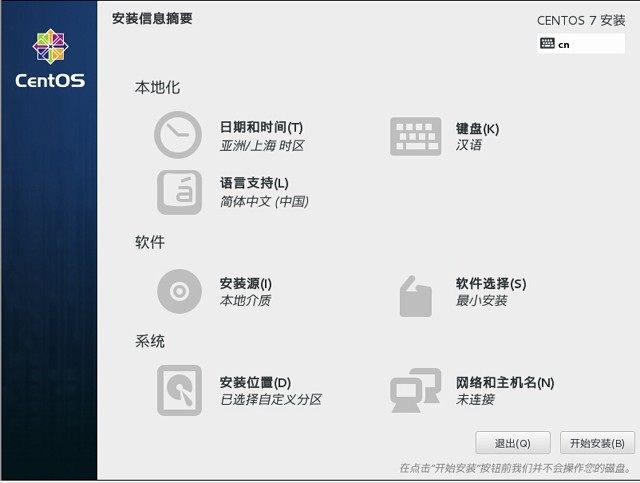 比较常用的是最小化安装(安装快,只有命令行操作) 带有桌面的安装(一些配置和使用都可以图形化操作,较好用) 服务器版安装(特定组件可以省掉自己安装的很多问题),这里选择最小化安装,另外可以根据自己的需要从右面选择部分组件安装 刚开始接触Linux的朋友建议使用GHOME图形操作界面,好上手