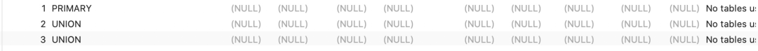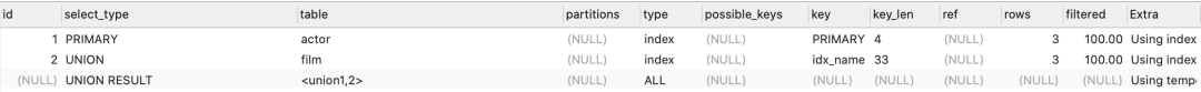 优先执行的是union后面的查询语句当前访问的是film表,接着执行union左边查询语句,当前查询的是actor表,最后查询的是依赖1和2的查询结果,所以使用<union1,2>