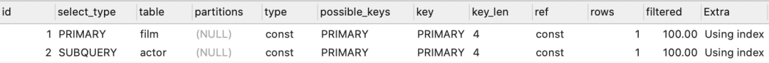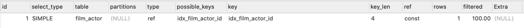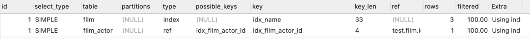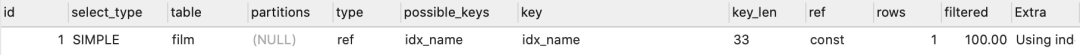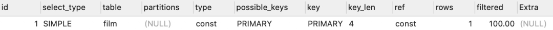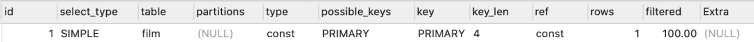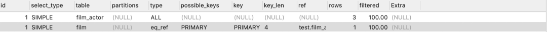 可以看出访问film表的时候,type达到了eq_ref级别,因为id字段在film表中是唯一的,所以查询film表的时候按照id查询只会有一条记录与其关联;