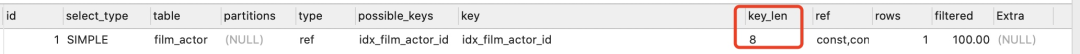 可以看到key_len是4,我们是根据联合索引字段的第一个字段进行过滤的,我们看下film_id字段的类型的int类型,结合上面的计算方式,file_id不能为NULL,那么key_len就是4;